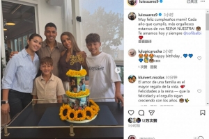 索菲亚迎来36岁生日,苏亚雷斯社媒晒出一家人为她庆生的合照,配文:“孩子们的妈妈生日快乐!你每过一岁生日,我们都为你感到更加骄傲,我们的女王!🎂爱你今天到永远。”
