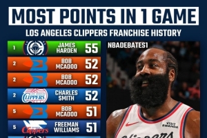 哈登快船生涯多次砍下50+ 继鲍勃·麦卡杜后队史第二人 !